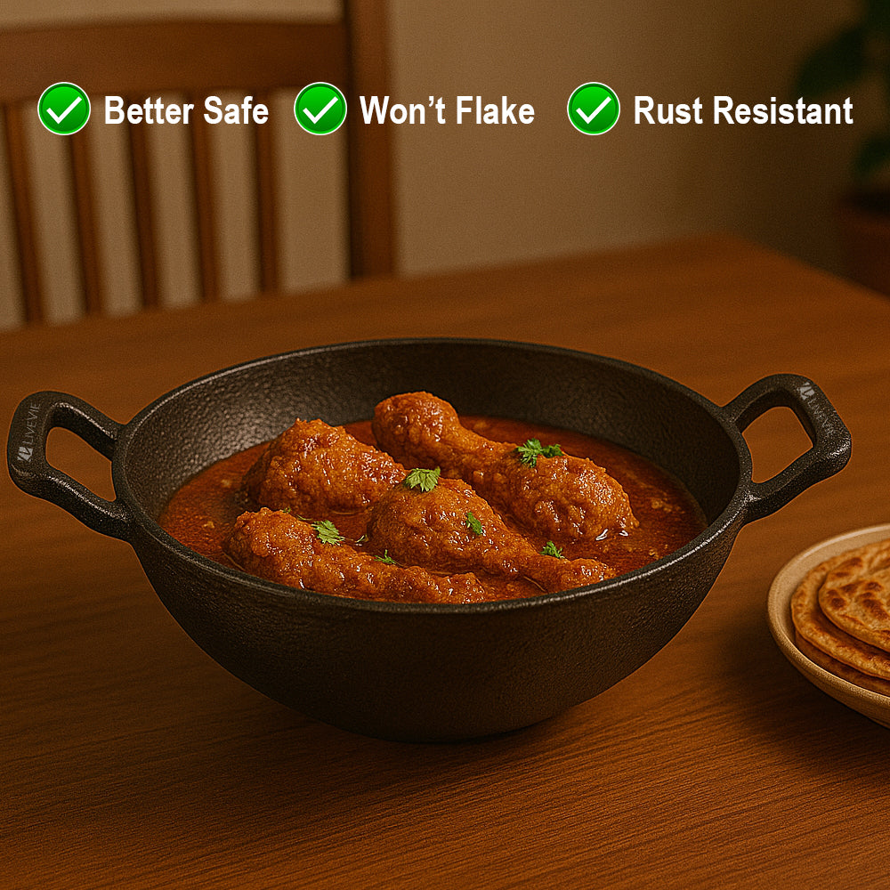 Whether you're cooking for a family dinner or a festive gathering, this durable cast iron kadai will quickly become a cherished part of your cookware collection.
